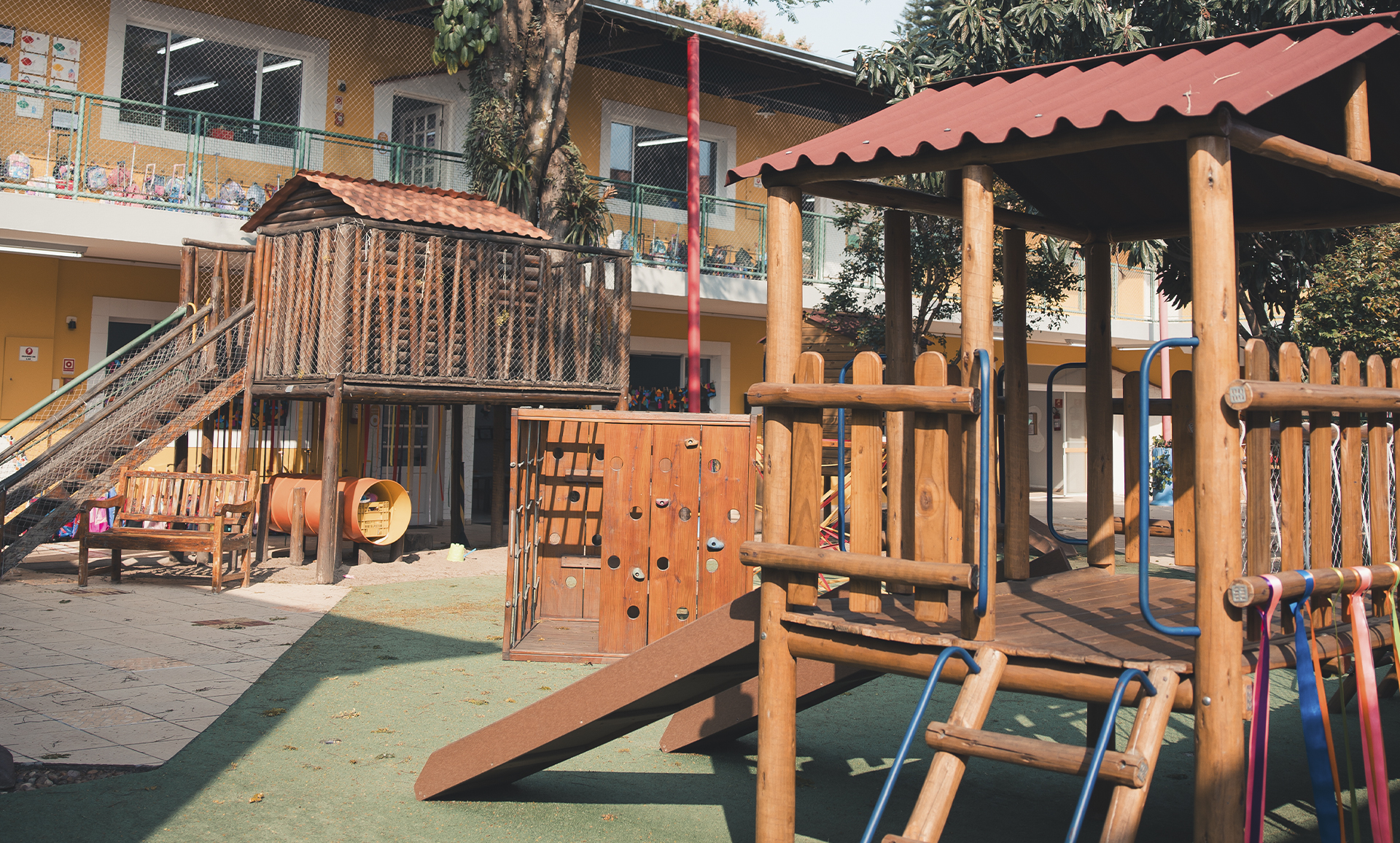 As salas de aula amplas e arejadas, muitas delas com varandas gramadas, proporcionam a oportunidade de realizar atividades ao ar livre, integrando o aprendizado à natureza. As áreas externas e de convivência foram ambientadas para estimular a curiosidade e o desenvolvimento infantil.